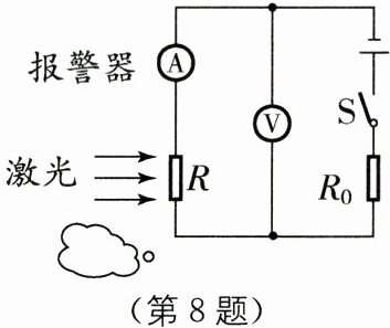 8. 为保障安全,现在很多室内公共场所安装有烟雾报警装置,如图所示是烟雾报警装置的简化原理图.电源电压保持不变,R₀为定值电阻,光敏电阻R的阻值随光照强度的减弱而增大,当电路中的电流减小至某一数值时报警器开始报警.当有烟雾遮挡射向光敏电阻R的激光时,下列说法正确的是( ).
