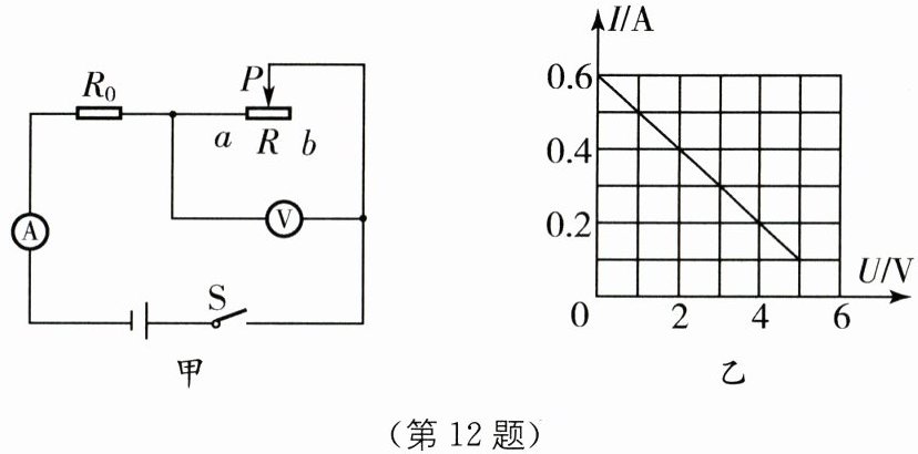 12. 如图甲所示的电路,当滑动变阻器的滑片从a端移至b端的过程中,电流表和电压表的示数关系如图乙所示,则电源电压为______V,R₀的阻值为______Ω.