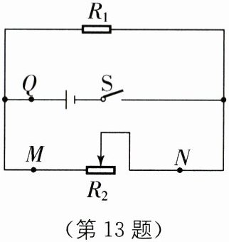 13. 如图所示电路中,由于接线柱接触不良导致电路发生了断路故障.若电路中仅有一处故障,且只发生在电阻$R_1、$$R_2$上.现通过接入一个电表来判断故障.