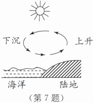 7 如图所示是海陆风形成的示意图.因为陆地上沙石的比热容比水的比热容______(填“大”或“小”);白天,阳光下陆地升温较______(填“快”或“慢”),热空气上升,空气从海面流向陆地,夜晚空气流向相反,由此形成海陆风.
