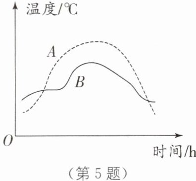 5 如图所示是某沿海城市和内陆城市在同一天的气温变化曲线,沿海城市气温变化对应的曲线是______(填“A”或“B”),这是由于水的比热容______(填“大于”或“小于”)沙石的比热容,相同质量的水和沙石吸收相同热量后沙石的温度变化较______(填“大”或“小”).