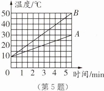 5 用两个相同的电热器给质量同为2 kg的物质A和B加热,它们的温度随时间的变化关系如图所示,则物质 ______(填“A”或“B”)的比热容大;物质A和物质B的比热容之比c_A:c_B= ______.