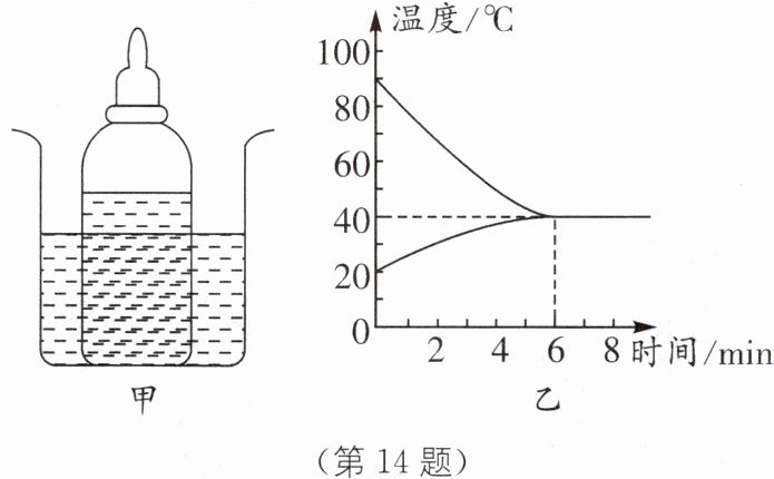 14 将盛有凉牛奶的瓶子放在热水中(如图甲所示),通过 ______的方式改变牛奶的内能. 图乙是250 g牛奶与热水的温度随时间变化的图像,则牛奶在加热过程中吸收的热量为 ______J.[c_奶$= 2.5×10^3 J/(kg·℃)]$