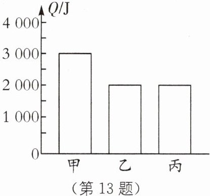 13 甲、乙两物体质量都为1 kg,丙物体质量为2 kg,三个物体温度都升高1 ℃,吸收热量如图所示. 以下说法正确的是( ).