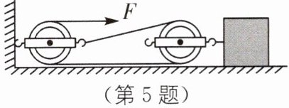 5. 如图所示,用力$F$拉重为400 N的木箱在水平地面上做匀速直线运动,木箱受到的摩擦力为200 N,则方向为水平向______;若木箱匀速运动了3 m,则拉力$F$移动的距离为______m,拉力$F$为______N.(不计滑轮重及绳与滑轮间的摩擦)