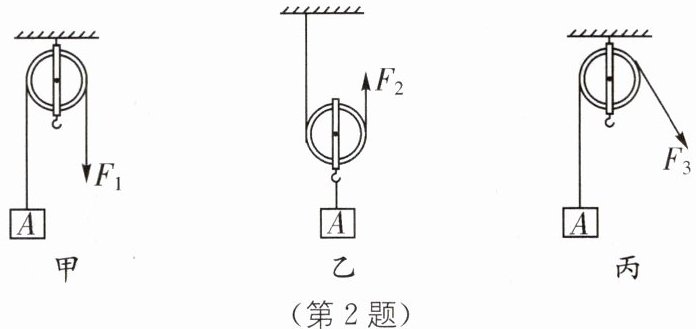 2. 如图所示的三个滑轮中,属于动滑轮的是______,若滑轮和绳的自重以及摩擦不计,当分别沿力$F_{1}$、$F_{2}和F_{3}$方向匀速提起同一物体时,$F_{1}$、$F_{2}$、$F_{3}$的大小关系是______.
