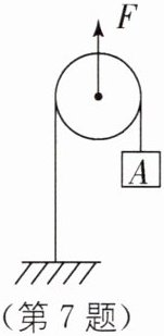 7. 提分优练 如图所示,在竖直向上大小为15 N的力$F$的作用下,重物A沿竖直方向2 s内匀速上升了0.8 m. 不计滑轮重、绳重及绳与滑轮间的摩擦. 求:(1)物体A的重力$G_{A}$. (2)滑轮上升的速度$v$.