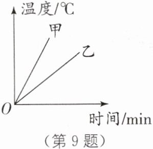 9 小明用相同的酒精灯给质量相等的甲、乙两种物质加热.根据测量数据描绘温度—时间的图像如图所示,由图可知,甲物质比热容______(填“>”“<”或“=”)乙物质比热容;通过查询得知乙物质的比热容为$1.5×10^{3}\ J/(kg·℃)$,酒精的热值为$3.0×10^{7}\ J/kg$,若酒精完全燃烧且放出的热量全部被乙物质吸收,则燃烧$0.5\ g$的酒精能使______kg的乙物质升高$10\ \degreeC$.实验完成后,酒精灯中剩余酒精的热值______(填“变大”“变小”或“不变”).