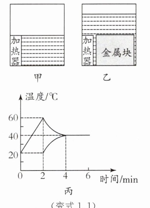 变式1.1 (2024·安徽淮北期中)有一个具有加热功能的保温容器,如图甲所示,在该容器中加入$3\ kg$的水,加热$2\ min$后停止加热,随后立即在容器中放入一个金属块,如图乙所示.水和金属块的温度变化情况如图丙所示.水的比热容$c_{水}= 4.2× 10^{3}\ J/(kg·℃)$,金属块的比热容$c_{金}= 0.63× 10^{3}\ J/(kg·℃)$,求: