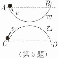 5 如图所示,同一个实心小球以同样的速度$ v $分别沿着甲、乙两个光滑的弧槽运动,两弧槽弧形相同,弧长相等.小球到达B点的动能______到达D的动能,小球通过甲弧槽的时间______(以上两空填“大于”“小于”或“等于”)小球通过乙弧槽的时间,图甲中小球由A到B的过程中动能的变化情况是______(空气阻力不计).