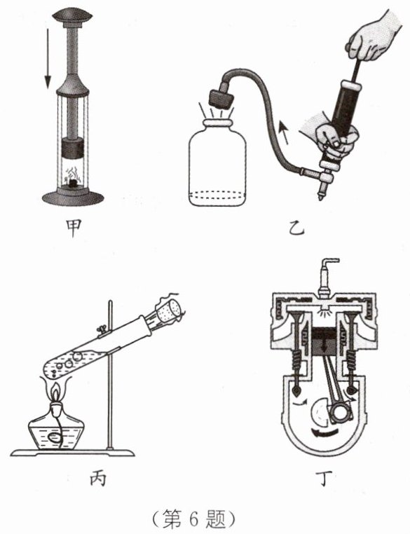 6.C [解析]题图甲中厚玻璃内的空气被压缩时,空气的质量不变,故A错误;题图乙中瓶子内的空气推动塞子跳起时,空气对活塞做功,内能转化为机械能,空气的内能减小,温度降低,水蒸气遇冷液化形成白雾,故B错误;题图丙试管内的水蒸气推动塞子冲出时,水蒸气的内能减小,故C正确;题图丁中汽缸内的气体推动活塞向下运动时(即做功冲程),内能转化为机械能,气体的内能减少,故D错误。