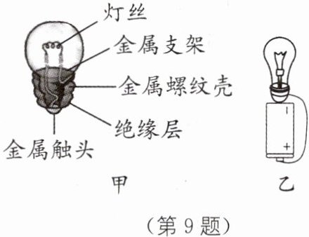9 如图所示,图甲为小灯泡的内部结构图,如图乙连接,各处接触良好,电池电量充足,此时______(填“有”或“没有”)电流经过小灯泡灯丝,此电路是______(填“通路”“断路”或“短路”).