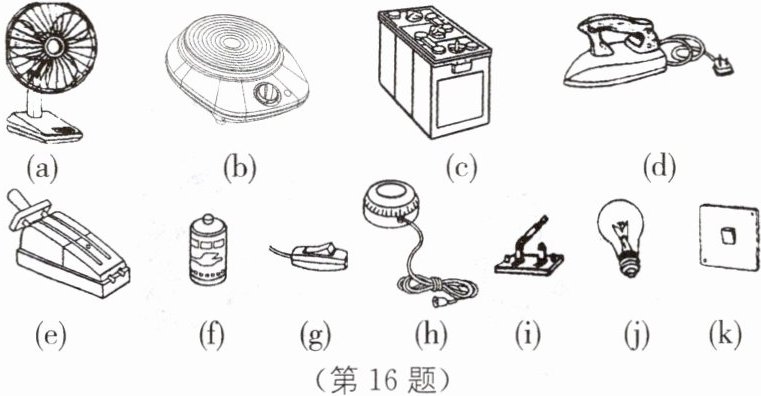 16 图中列出了一些日常生活与生产中用到的电源、用电器和开关,你能区分它们吗?请把它们按要求分类.(填序号)