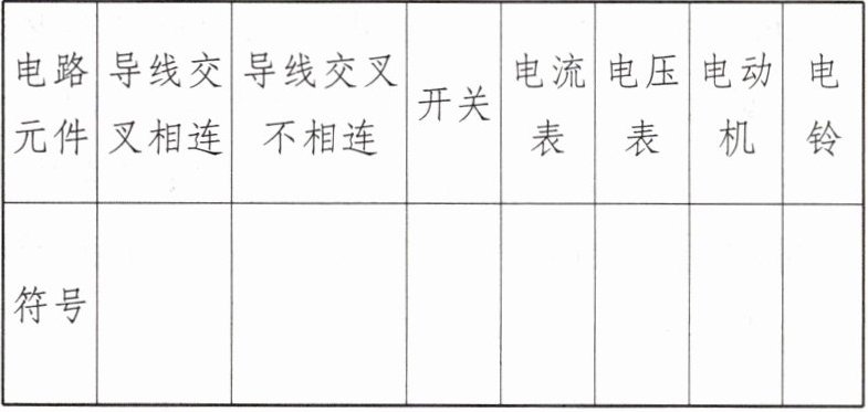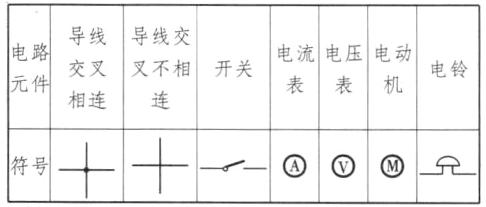 | 电路元件 | 导线交叉相连 | 导线交叉不相连 | 开关 | 电流表 | 电压表 | 电动机 | 电铃 |