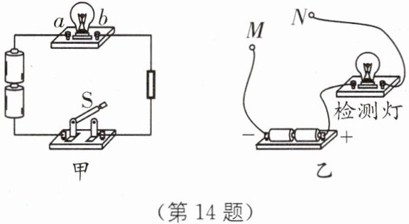 14 (2024·甘肃武威期末)物理课上,老师拿出一个电路板,如图甲所示,开关S闭合后,发现灯L不亮.现已确定是灯L短路或L断路引起的,要求检测是哪一种故障,小羽做了如图乙所示的检测电路,将故障电路的开关S断开,分别把M、N接到a、b接线柱上,若检测灯亮,则故障是______;若检测灯不亮,则故障是______.