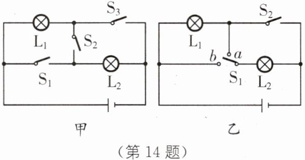 14 为实现接在同一电路中的两灯既可串联又可并联,小明和小芳分别设计了如图甲、乙所示的电路.图甲中,只闭合开关______时,两灯串联;图乙中,当开关$S_1$拨到______且$S_2______$时,两灯并联.对比甲、乙两图的结构可知,小芳的设计比小明的设计更合理之处是______.