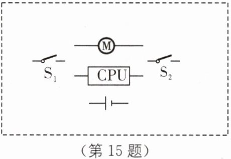 15 电脑正常工作时须用风扇给中央处理器(CPU)散热.为保护CPU,要求CPU启动前,带动风扇的电动机要先启动;CPU断电后,风扇仍继续工作进行散热;$S_1$断开后,CPU与风扇同时停止工作.请在题图虚线框内根据要求完成电路设计.