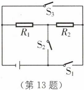 13 如图所示,只闭合$S_1,$电阻$R_1、$$R_2$组成______电路;断开$S_1,$闭合$S_2、$$S_3,$电阻$R_1、$$R_2$组成______电路;同时闭合$S_1、$$S_3,$会造成______.