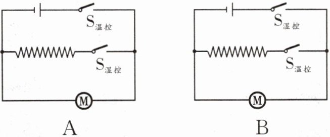 12 (2024·常州中考)某款电子垃圾桶可以将湿的厨余垃圾变干,作为动物饲料,将湿的厨余垃圾倒入垃圾桶,电路检测到桶内为湿垃圾时,就吹风.吹风过程中:当桶内温度低时,吹热风;当桶内温度高时,吹冷风……直至垃圾变干.之后,整个电路结束工作.开关S湿控在垃圾潮湿时闭合、干时断开;开关S温控在桶内温度低(≤60℃)时闭合、温度高(>60℃)时断开.下列电路中符合要求的是( ).
