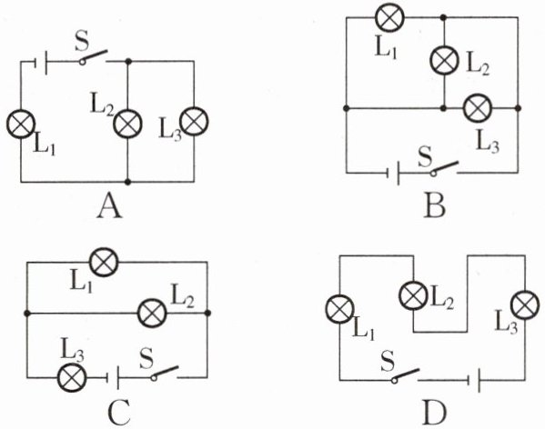 11.B [解析]闭合开关S后,图A电路中电流从电源正极经过开关S后分别流经灯泡L₂与L₃,再流过灯泡灯L₁,最后流回电源负极,三个灯为混联,故A不符合题意;图B电路中电流从电源正极经过开关S后分别流经灯泡L₁、L₂和L₃,最后流回电源负极,三个灯为并联,故B符合题意;图C电路中电流从电源正极经过开关S后分别流经灯泡L₁与L₂,再流过灯泡L₃最后流回电源负极,三个灯为混联,故C不符合题意;图D电路中电流从电源正极依次流经灯泡L₃、L₂、L₁再经过开关S,最后流回电源负极,三个灯为串联,故D不符合题意.故选B.