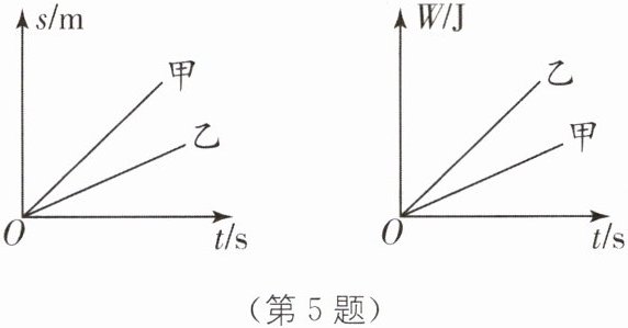 5. 在水平地面上的甲、乙两个物体在水平牵引力$ F_{甲} $、$ F_{乙} $作用下都做匀速直线运动,它们运动的路程和所做的功随时间变化的图像分别如图所示,