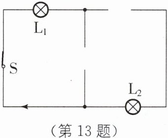 13 如图所示,根据电路中标出的电流方向,选择电源、电流表、电压表三个元件中的两个符号填入电路空缺处,使两只灯泡并联.