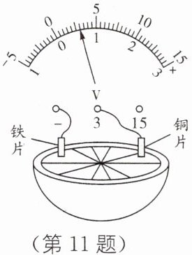 11 (2024·淮安中考)如图所示,取一个橙子,把铜片、铁片插入其中,制成一个水果电池.