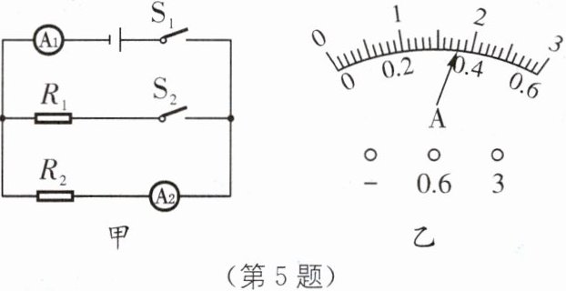 5 (2024·泰州中考)如图甲所示电路,开关S1、S2闭合后,两电流表的指针均指在同一位置,示数如图乙所示,则通过R1的电流为 A;只断开开关S2,电流表A1的示数将 (填“变大”“变小”或“不变”).