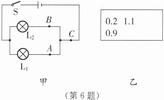 6 图甲是小明同学探究并联电路的电流规律时使用的电路图. 实验中他用电流表分别测出A、B、C三处的电流I_A、I_B、I_C. 小明没有及时将数据整理到相应表格中而是随手记录到草稿纸上. 如图乙所示,已知通过L1的电流较大. 下列选项中三处电流均正确的是( ).
