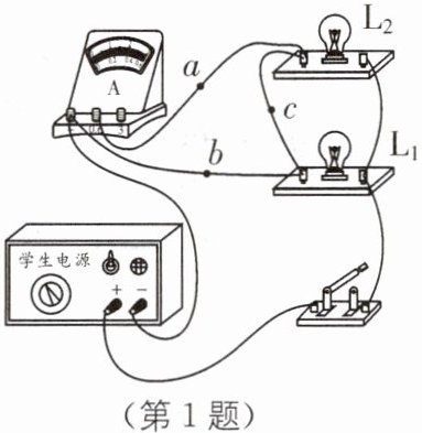D [解析]由题图可知,撤掉导线a,电流分别经灯泡L₁、L₂后经导线回负极,电流表没有接入电路,故电流表测量的既不是总电流,也不是小灯泡L₁的电流,故A、B错误;撤掉导线b,电流从电源正极出发分两支,一支经灯泡L₁、一支经灯泡L₂,然后共同经电流表回负极,即电流表测量的是电路的总电流,故C错误;撤掉导线c,电流表和灯泡L₂在同一支路上,则电流表测量的是小灯泡L₂的电流,故D正确.