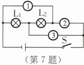 7 小明利用如图所示的电路进行实验,电源为两节干电池,①、②、③是三个电表(分别为电压表或电流表). 闭合开关S,灯L1与L2并联,则电路中 是电压表. 实验过程中,粗心的小明只记录了三个表的示数为0.2、3、0.5,请你根据小明的实验结果,推算流过L1的电流为 A,流过L2的电流为 A.