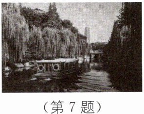 7. 提分优练 在泉城济南,游客乘坐画舫游船穿行其间,可以尽享“不出城郭而获山水之怡,身居闹市而有林泉之致”的都市休闲意趣.如图所示,若画舫游船质量为3 t,从黑虎泉站出发以3.5 m/s的速度匀速行驶到泉城广场站,所用时间约为5 min,牵引力是$6×10^3 N.g$取10 N/kg,通过计算回答: