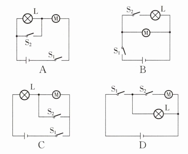 D [解析]由题意知,S₁闭合,灯L发光,照亮人脸进行识别,但不开锁,人脸识别成功后S₂闭合,电动机M工作,即两开关都闭合时电动机才能工作,这说明灯泡与电动机是并联的,开关S₁在干路中,S₂在电动机的支路中,故D正确.