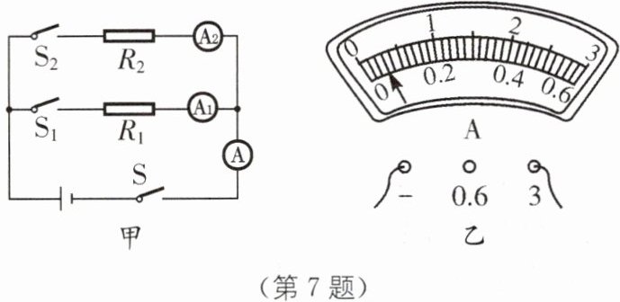 7 在研究并联电路电流特点时,按如图甲所示电路图连接好电路. 闭合开关S和$S_{1}$,观察电表示数,再闭合开关$S_{2}$,示数保持不变的电流表是______(电源电压不变),同时小明观察到电流表A的示数如图乙所示,为了使测量更精确,断开开关后,接下来的操作是______.