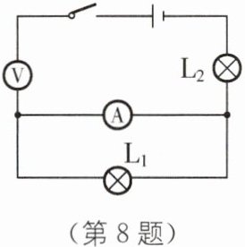 D [解析]由题图知,电压表串联在电路中,电流表并联在L₁两端,而电压表的内阻很大,电路中的电流几乎为0,电流表电阻很小,L₁被短路,故两个灯泡都不会发光,电流表指针几乎不动,此时电压表测电源电压,则电压表指针发生较大偏转,故D正确.关键提醒 电压表的内阻很大,在电路中当成断路看待,电流表内阻很小,在电路中当成导线看待.