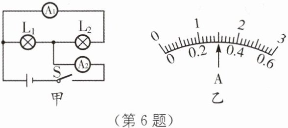 6 如图甲所示的电路中,闭合开关,两灯泡均发光,且两个完全相同的电流表的指针偏转均如图乙所示,则通过灯泡$L_{1}和L_{2}$的电流分别为( ).