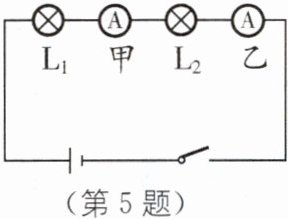 5 连接如图所示电路,研究串联电路中电流的特点. 实验时电流表甲和乙的示数分别为0.18 A和0.16 A,造成两个电流表示数不同的原因可能是( ).