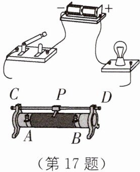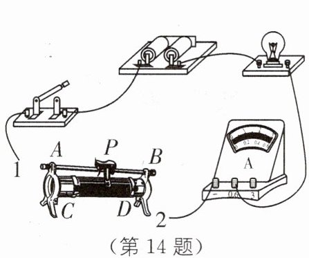 14 小明利用图中所示的滑动变阻器控制小灯泡的亮暗,所用实验器材均完好.当他连接好电路后任意移动滑片,小灯泡亮度始终不变且较暗,滑动变阻器所接的接线柱是______和______.小明查找原因并纠正后,当导线1与C连接,导线2与______连接后,向______端移动滑片P,小灯泡会变亮.(前3空填“A”“B”“C”或“D”)