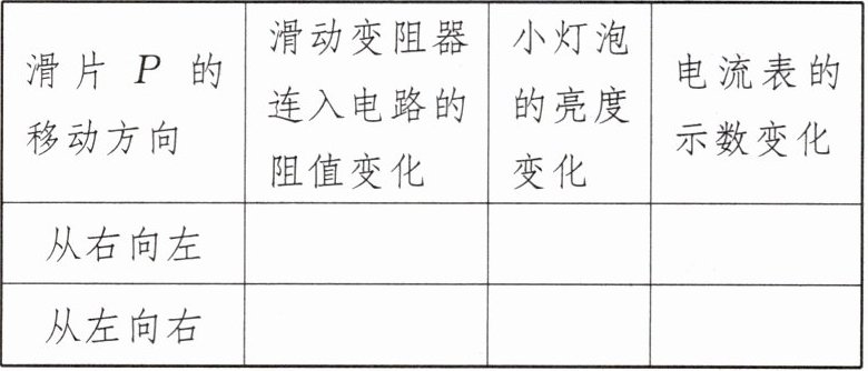 | 滑片P的移动方向 | 滑动变阻器连入电路的阻值变化 | 小灯泡的亮度变化 | 电流表的示数变化 |