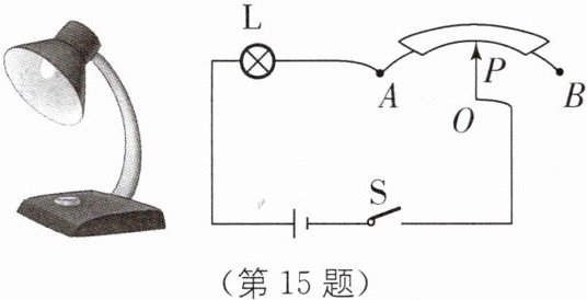 15 如图所示是一个可调节亮度的台灯和它的简易电路原理图,其中APB是一个______,当滑片P向A端移动时,连入电路中的电阻变______,电路中的电流变______.
