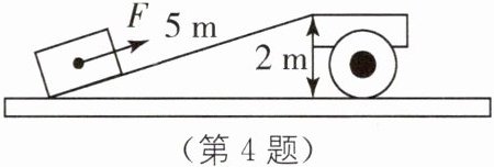 4. 新情境 抗洪抢险搬重物 在抗洪抢险行动中,小军帮受灾百姓把一个质量为240 kg的重物搬到2 m高的车上,为了省力他采用5 m的长木板搭了一个斜面(如图所示)。搬运过程中,他用沿斜面向上1200 N的力,历时5 min将重物匀速地推到车上,g取10 N/kg。关于此斜面,下列说法正确的是( )。