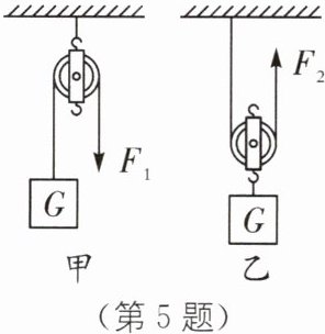 5. 两个完全相同的滑轮,分别以图示两种方式,将重为G的物体在相同时间内提至相同高度,不计绳重和摩擦,甲、乙装置的机械效率为$\eta_{1}$、$\eta_{2}$,拉力$F_{1}$、$F_{2}做的功分别为W_{1}$、$W_{2}$,功率分别为$P_{1}$、$P_{2}$,下列判断正确的是( )。