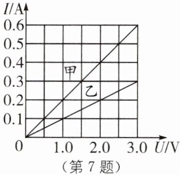 B [解析]由图像可知,当通过甲、乙的电流都是0.3 A时,乙两端电压大于甲两端电压,由 $ R=\frac{U}{I} $ 可知乙的电阻大于甲的电阻,故 A 错误;由图像可知,通过导体乙的电流与其两端的电压成正比,故 B 正确;当导体甲两端的电压为 2 V时,从图像中读出此时通过甲的电流为 0.4 A,故 C 错误;由并联电路的特点可知,当导体甲与乙并联后接入电路中它们两端的电压相等,当 $ U_{甲}=U_{乙}=3\ V $ 时, $ I_{甲}=0.6\ A $, $ I_{乙}=0.3\ A $,干路中的电流 $ I=I_{甲}+I_{乙}=0.6\ A+0.3\ A=0.9\ A $,故 D 错误.