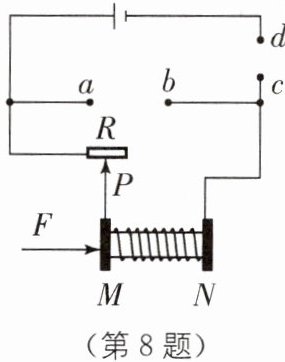 8 如图所示是一握力计的电路示意图,a、b、c、d是四个接线柱,仪表及定值电阻R₀均未画出. M、N均为金属板,N固定不动,当金属片P向左移动时,R接入电路的阻值变____. 若握力F增大时,要求仪表的示数也增大,则a、b之间应接入____,c、d之间应接入____. (后两空填“定值电阻”“电流表”或“电压表”)