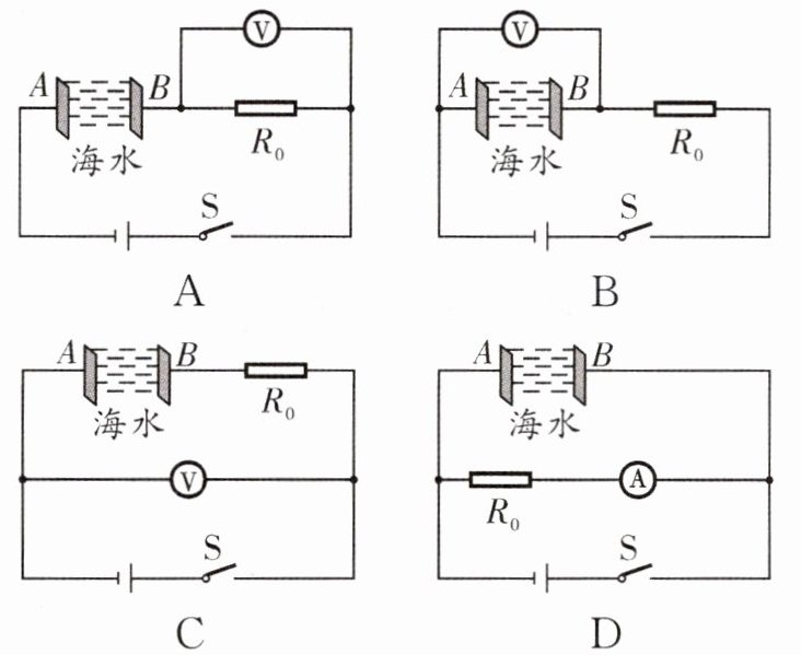 12 (2024·常州中考)海水盐浓度越大,其导电性越好,固定间距金属片A、B之间海水的电阻越小. 下列电路中,电源电压恒定,R₀为定值电阻,闭合开关S,海水盐浓度越大,电表示数越大的是( ).