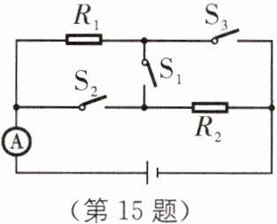 15 如图所示的电路,电阻$R_1$的阻值为10 Ω,电源电压不变. 当$S_1、$$S_2$断开$,S_3$闭合时,电流表的示数为1.2 A;当$S_1$断开$,S_2、$$S_3$闭合时,电流表的示数为1.5 A. 求: