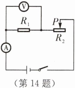 14 (2024·徐州新沂期末)如图所示的电路中,电阻$R_1$的阻值为30 Ω. 闭合开关,当滑片P在滑动变阻器$R_2$最右端时,电压表的示数为4.5 V;当滑片P移到滑动变阻器中点时,电压表的示数为6 V. 求: