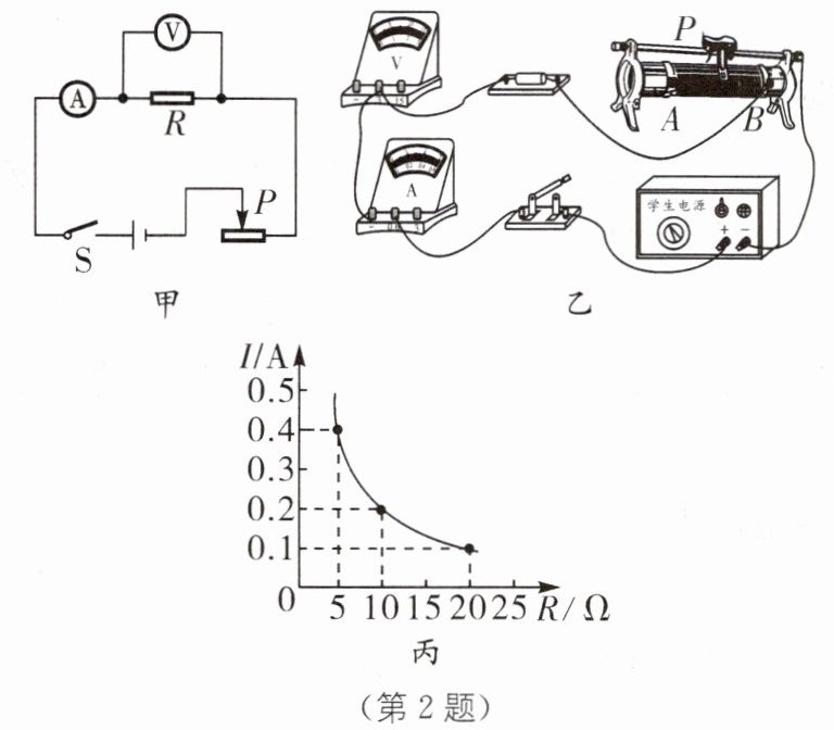 2. “探究导体中电流跟电阻的关系”的实验中,实验器材有:学生电源(6 V),电流表(0~0.6 A,0~3 A)、电压表(0~3 V,0~15 V)、定值电阻(5 Ω、10 Ω、20 Ω各一个)、开关、滑动变阻器(甲“50 Ω 1 A”,乙“10 Ω 2 A”)和导线若干.