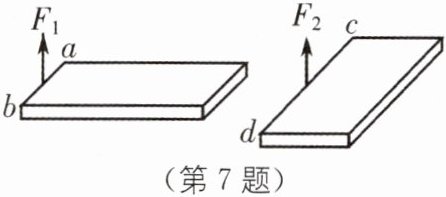 7 如图所示,质量均匀且相同的两块砖平放在水平地面上,现用竖直向上的力$F_1、$$F_2$分别作用在ab、cd的中点,使它们缓慢地竖直立起来,且砖不在地面上滑动。当砖的边ab、cd刚离开地面时$,F_1______($填“>”“<”或$“=”)F_2;$在ab边不断抬高的过程中$,F_1$的大小将______(填“变大”“变小”或“不变”)。