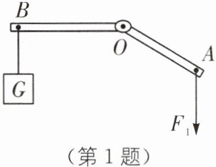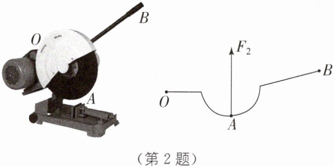 2 新情境 金属切割机切钢管 如图所示是一台金属切割机,小王师傅用该机切割A点下方的钢管时,用力压B点,机器OAB部分可绕O点转动。请在图中画出作用在B点的最小动力$F_1$及其力臂$l_1。$